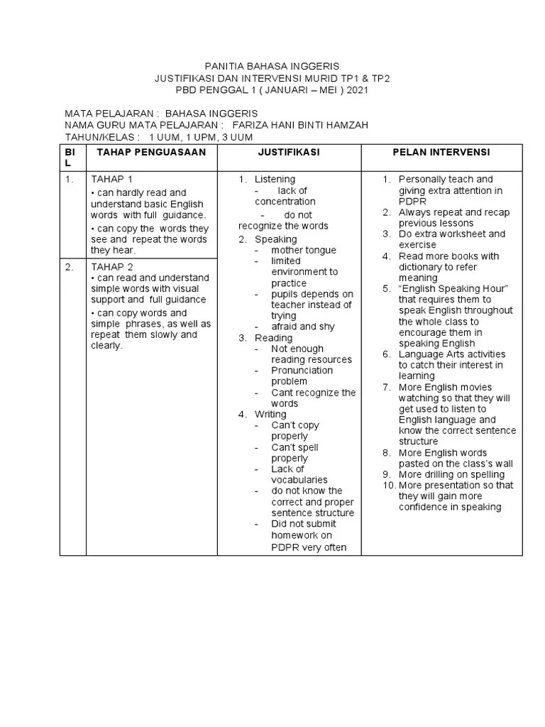 Tahap Penguasaan Pbd Bahasa Inggeris - Justifikasi Intervensi Pbd Bi Semester 1 Pdf English Language Human Communication
